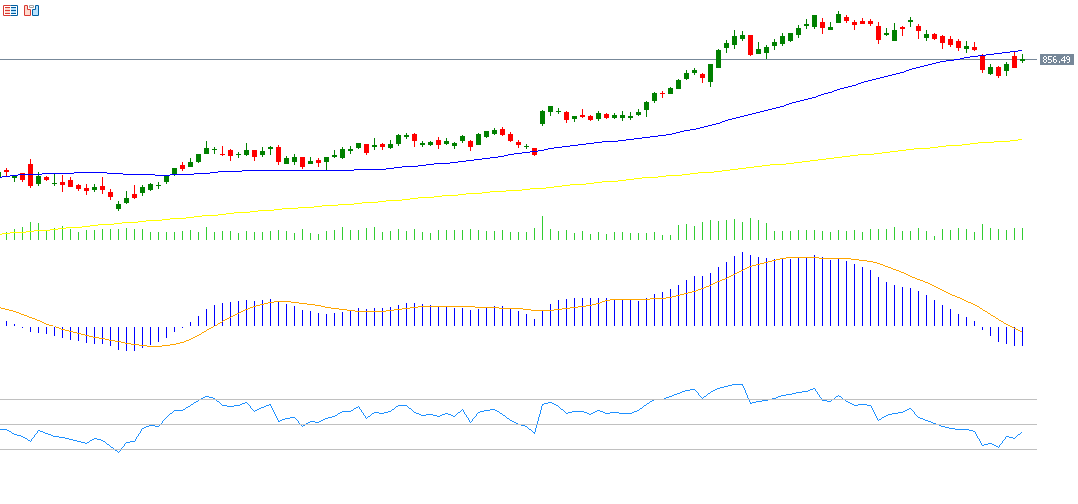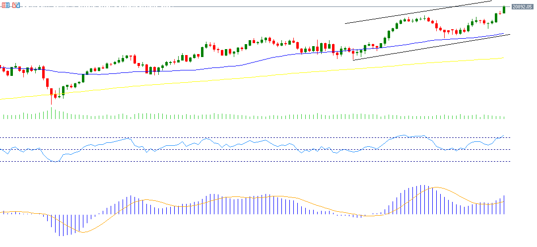 اللافت في الأمر هو أنه على الرغم من الانكماش الاقتصادي الألماني والعوامل السلبية التي تحيط بالداخل الألماني، خاصة من الناحية السياسية، إلا أن الصورة تأتي معاكسة تمامًا بالنسبة للأسهم الألمانية. إذ يستمر مؤشر داكس الألماني في مساره الصاعد، مسجلًا يوم الجمعة 17 يناير مستوى 20,921 نقطة، وهو أعلى مستوى له على الإطلاق. وارتفع هذا المؤشر بنحو 5% منذ مطلع العام حتى اليوم. أما بالنسبة لمؤشر القوة النسبية، فهو يسجل حاليًا حوالي 72 نقطة، في منطقة التشبع الشرائي، ما يشير إلى الزخم الإيجابي للداكس.