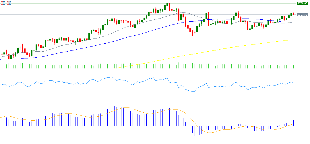 ارتفعت أسعار الذهب بنحو 3% منذ مطلع العام حتى اليوم، مسجلةً قرابة 2,700 دولار حاليًا. ويبدو أن الاتجاه الصعودي سيظل سائدًا في هذه المرحلة، خاصةً أن هناك عوامل عديدة تدعم أسعار الذهب مثل استمرار البنوك المركزية العالمية في شراء الذهب، وتخفيض أسعار الفائدة الأميركية في المرحلة القادمة، والتضخم الأميركي الذي لا يزال راسخًا. أما مؤشر القوة النسبية (RSI) فيسجل حاليًا 59 نقطة، ما يشير إلى الزخم الصعودي للذهب. أما مؤشر MACD، فيظهر تقاطع صعودي بين مؤشر MACD باللون الأزرق مع الـ SIGNAL LINE باللون البرتقالي، مما يعطي زخمًا صعوديًا للذهب.