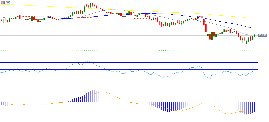 ارتفعت أسعار النفط الخام بنحو 10% منذ القاع المسجل يوم الإثنين من الأسبوع الماضي عند 58.44 دولار، وصولًا إلى القمة التي بلغتها يوم الجمعة عند 64.22 دولار، وتستقر الأسعار حاليًا قرب مستوى 64.00 دولار وسط حالة من الضبابية تسيطر على السوق، في ظل تباين العوامل المؤثرة. أما على صعيد الأداء السنوي، فقد تراجعت الأسعار بنحو 15% منذ بداية العام. ويسجل مؤشر القوة النسبية (RSI) حاليًا 47 نقطة، ما يشير إلى زخم هبوطي. ومع ذلك، يُظهر مؤشر MACD تقاطعًا صعوديًا بين خط MACD باللون الأزرق وخط الإشارة باللون البرتقالي، ما يعكس بعض الزخم الإيجابي المحتمل.