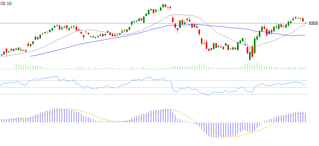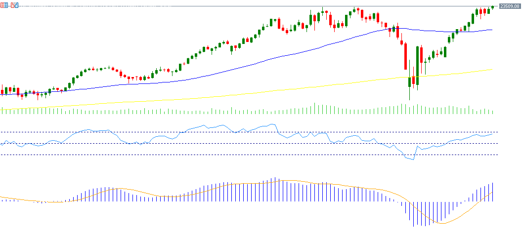 سجل مؤشر داكس الألماني مستوى قياسيًا جديدًا عند 23,543 نقطة يوم الجمعة 9 مايو 2025، وهو أعلى مستوى له على الإطلاق. وارتفع المؤشر بنحو 18% منذ بداية العام، متفوقًا على مؤشر CAC40 الفرنسي (5%)، ومؤشر FTSE 100 البريطاني (5%)، ومؤشر STOXX600 الأوروبي (6%)، وكذلك على مؤشرات الأسهم الأميركية مثل S&P 500 الذي تراجع بنسبة 4%، وNasdaq 100 الذي تراجع بنسبة 5%. ويسجل مؤشر القوة النسبية (RSI) حاليًا 67 نقطة، ما يشير إلى زخم صعودي قوي. كما يظهر مؤشر MACD تقاطعًا صعوديًا بين خط MACD باللون الأزرق وخط الإشارة باللون البرتقالي، ما يعزز النظرة الإيجابية لمؤشر داكس.