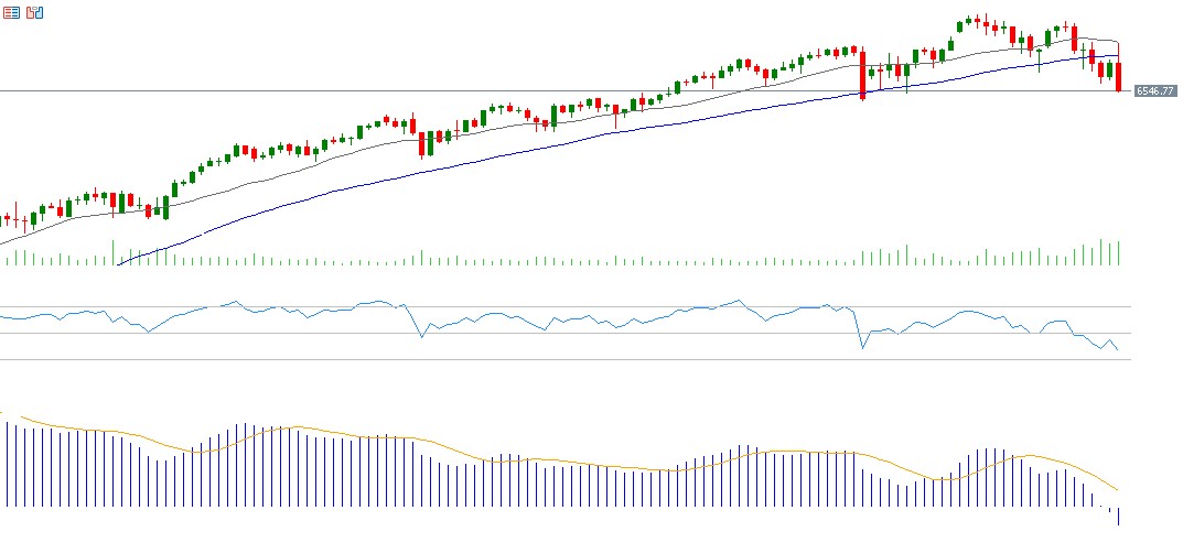 ومن الناحية الفنية، يتداول مؤشر S&P 500 دون المتوسط المتحرك لـ20 يومًا عند 6,773 نقاط، ودون المتوسط المتحرك لـ50 يومًا عند 6,711 نقاط. ويبقى التحدي القادم في ما إذا كان المؤشر سيختبر مستوى الدعم الاستراتيجي وهو المتوسط المتحرك لـ200 يوم عند 6,160 نقاط. ويسجل مؤشر القوة النسبية (RSI) مستوى 35 نقطة، ما يعكس زخمًا هبوطيًا للمؤشر. كما يظهر تقاطع نزولي بين خط الماكد (MACD) وخط الإشارة (Signal Line) داخل المنطقة السلبية، وهو ما يؤكد استمرار الزخم السلبي.