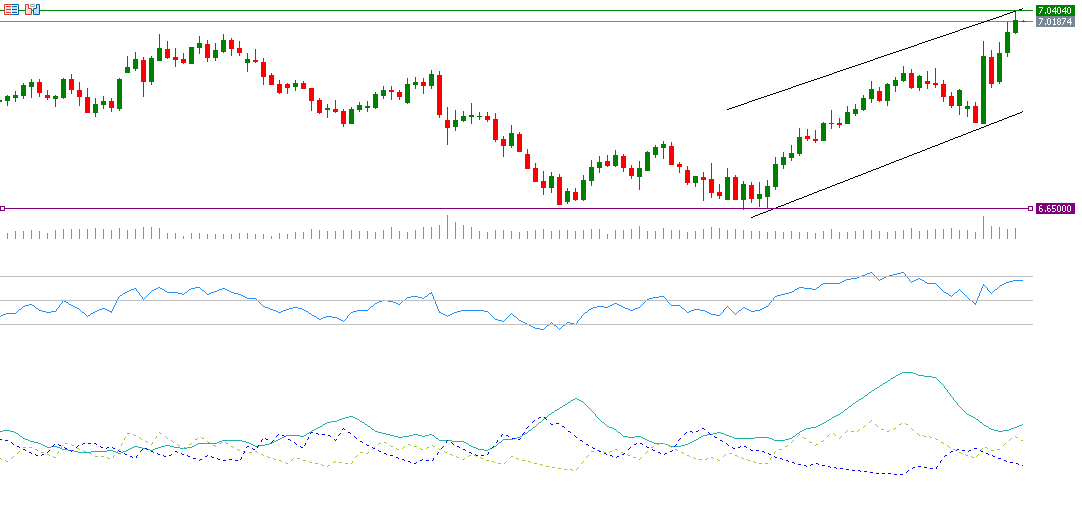 ويُسجل مؤشر التحرك الإيجابي (DMI+) حوالي 32 نقطة، مقابل مؤشر التحرك السلبي (DMI-) الذي يسجل حوالي 8 نقاط. نلاحظ أن الفجوة كبيرة بين هذين المؤشرين، مما يعني أن الضغوط الشرائية على الدولار الأميركي مقابل الكرونة الدنماركية قوية. والأهم من ذلك أن مؤشر قوة الاتجاه (ADX) يسجل حوالي 40 نقطة، مما يعني أن زخم هذا الاتجاه الصاعد قوي.