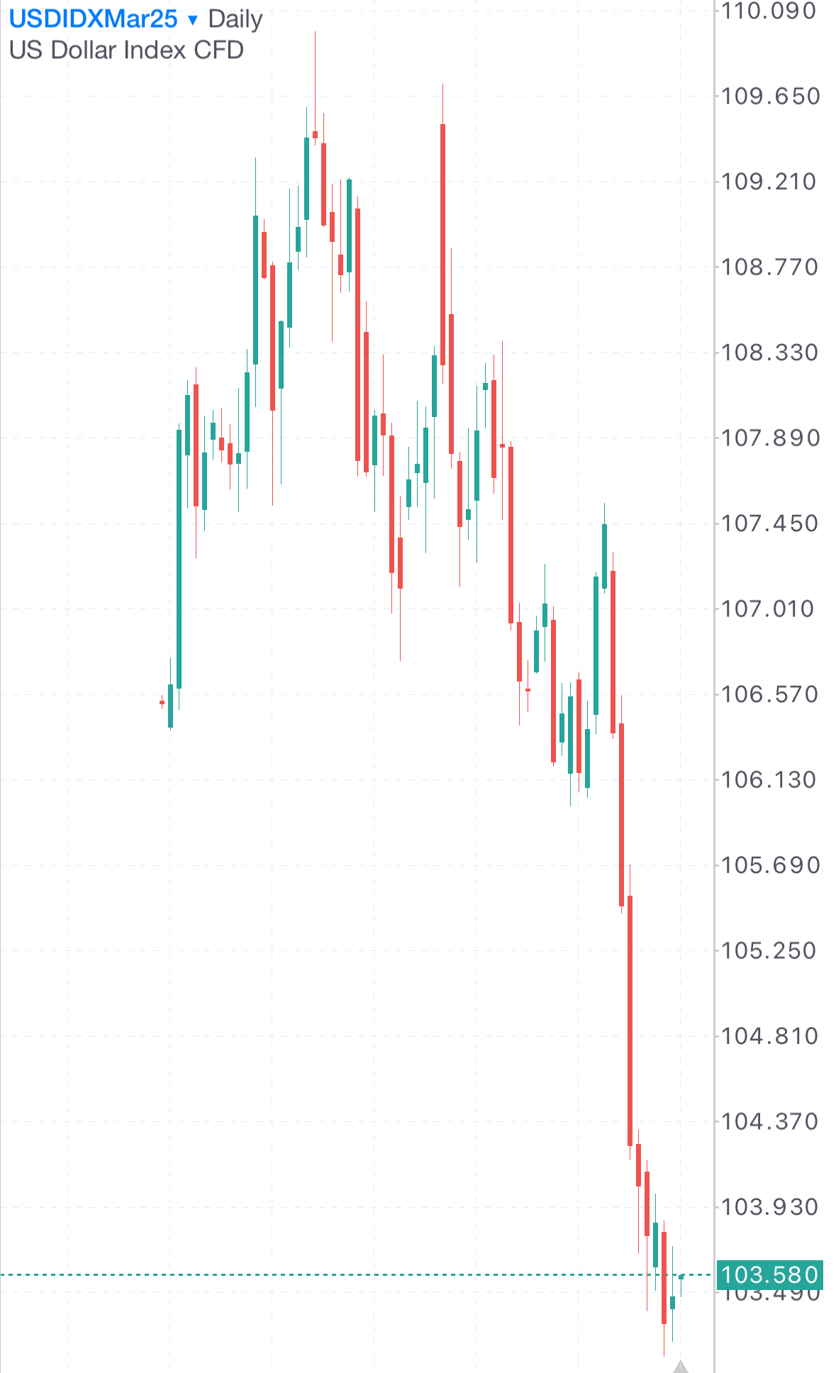 بعد أن وصل مؤشر الدولار الأميركي، الذي يقيس أداء الدولار مقابل سلة من ست عملات، إلى أعلى مستوى له هذا العام في 13 يناير 2025 عند 110.17 نقطة، تراجع إلى 103.22 نقطة منذ يومين، وهو أدنى مستوى له منذ 16 أكتوبر 2024، مسجلًا انخفاضًا بنحو 6%. حاليًا، يتداول المؤشر حول مستويات 103.60 نقطة، كما انخفض بنحو 4% منذ بداية العام حتى اليوم.