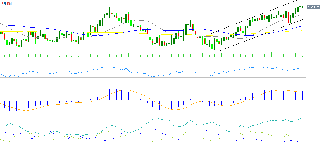 ويُسجل مؤشر التحرك الإيجابي (DMI+) حوالي 22 نقطة، مقابل مؤشر التحرك السلبي (DMI-) الذي يسجل حوالي 7 نقاط. نلاحظ أن الفجوة كبيرة بين هذين المؤشرين، مما يعني أن الضغوط الشرائية على الدولار الأميركي مقابل الكرونة النرويجية قوية. والأهم من ذلك أن مؤشر قوة الاتجاه (ADX) يسجل حوالي 40 نقطة، مما يعني أن زخم هذا الاتجاه الصاعد قوي.