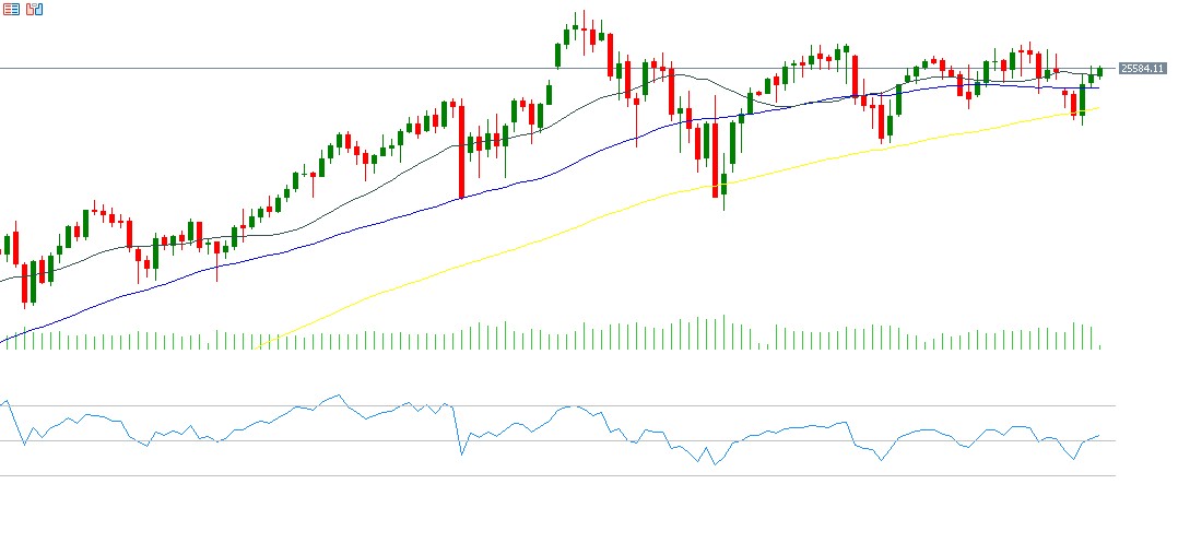 ومن الناحية الفنية، تشير المؤشرات إلى استمرار الاتجاه الصعودي لمؤشر Nasdaq 100، لا سيما مع استمرار الانتظام الإيجابي في المتوسطات المتحركة لـ20 و50 و200 يوم، حيث يتجاوز متوسط 20 يومًا متوسط 50 يومًا، والذي بدوره يتجاوز متوسط 200 يوم، ما يعكس ترتيبًا فنيًا إيجابيًا. ويكمن التحدي القادم في قدرة مؤشر Nasdaq 100 على الوصول إلى المستوى القياسي الذي سجله في 29 أكتوبر 2025 عند 26,182 نقطة. كما اخترق مؤشر القوة النسبية RSI مستوى 50 نقطة مسجلًا نحو 52 نقطة، ما يعكس استمرار الزخم الإيجابي.