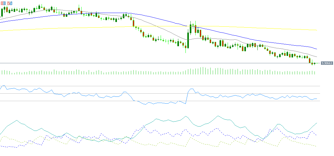 ويسجل مؤشر التحرك الإيجابي (DMI+) حوالي 9 نقطة، مقابل مؤشر التحرك السلبي (DMI-) الذي يسجل حوالي 27 نقطة. ويُلاحظ أن الفجوة بين المؤشرين كبيرة، مما يدل على أن الضغوط البيعية على الدولار الأميركي مقابل الكرونا النرويجية قوية.