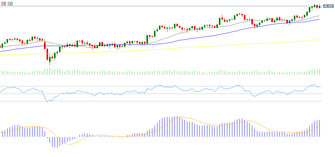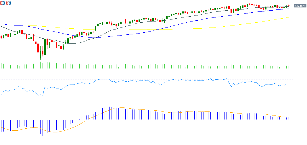 ارتفع مؤشر Nasdaq100 بنحو 1% الأسبوع الماضي، ليغلق عند مستوى 23,652 نقطة يوم الجمعة. وارتفع المؤشر بنحو 13% منذ مطلع العام حتى اليوم، ويعود ذلك إلى النتائج الإيجابية لمعظم الشركات الأميركية للربع الثاني من هذا العام، واستمرار الزخم الإيجابي لأسهم التكنولوجيا العظماء السبع حيث سجل المؤشر المكون من الأسهم السبعة (MAGS) مستوى قياسيًا جديدًا يوم الجمعة، بالإضافة إلى توقعات الأسواق بخفض الاحتياطي الفيدرالي لأسعار الفائدة الأميركية مرتين هذا العام. أما مؤشر القوة النسبية RSI فيسجل حاليًا 57 نقطة، ما يشير إلى الزخم الصعودي للمؤشر.