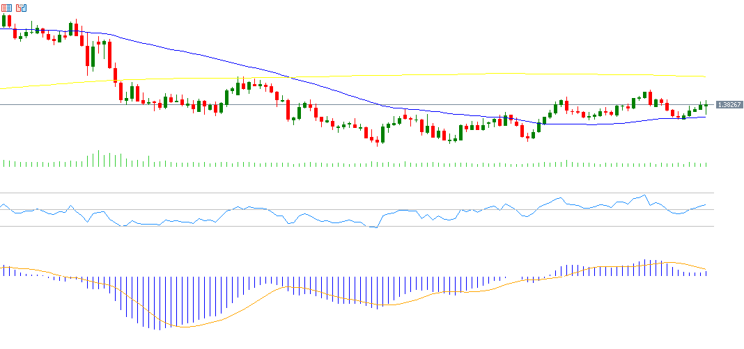 سجل سعر الدولار الأميركي مقابل الدولار الكندي يوم الجمعة مستوى 1.3854، وهو الأعلى منذ 27 أغسطس 2025، وأغلق عند مستوى 1.3822. وقد تراجع بحوالي 4% منذ بداية العام حتى تاريخه. أما مؤشر القوة النسبية RSI فيسجل حاليًا 55 نقطة، ما يشير إلى الزخم الإيجابي للزوج. أما مؤشر MACD، فيظهر تقاربًا بين مؤشر MACD باللون الأزرق مع الـ SIGNAL LINE باللون البرتقالي، وأي تقاطع صعودي بينهما مما يعطي زخمًا صعوديًا للزوج.