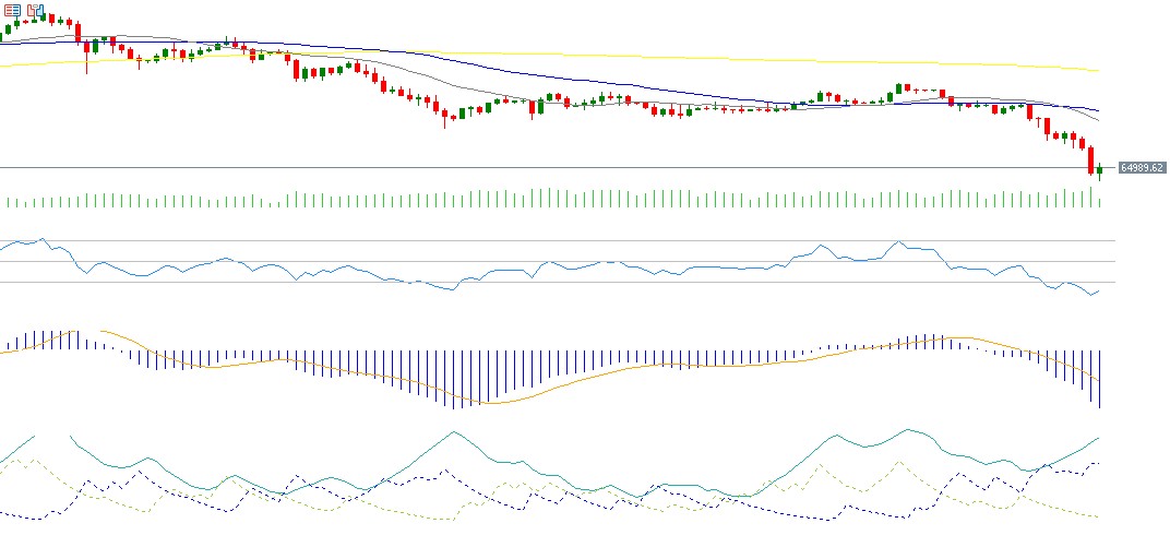 - The positive directional movement indicator (DMI+) stands near 6, compared with 42 for the negative directional movement indicator (DMI-), with a widening gap between them, signaling strong selling pressure. The Average Directional Index (ADX) is around 42, indicating a strong downward trend.