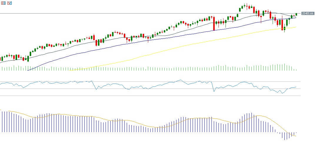 The Nasdaq-100 rose about 5% last week; however, its monthly performance remains negative at –1.64% after seven consecutive months of gains. The index closed Friday at 25,435 points. The VIX volatility index fell below 16, its lowest level in a month. Expectations remain upbeat for continued positive momentum in U.S. equities despite stretched valuations, supported by stronger-than-expected earnings from most U.S. companies—especially mega-cap tech firms tied to AI, known as the “Magnificent 7”—and rising market bets (85% probability) of a 25-basis-point rate cut at the Federal Reserve’s December 10 meeting. The RSI currently reads 56, indicating bullish momentum. The MACD shows a bullish crossover, supporting the upward trend in the Nasdaq-100.