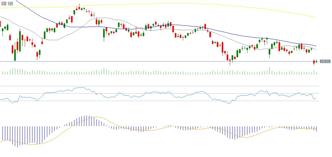 Salesforce stock has declined by around 31% year-to-date. Markets are awaiting the company’s earnings release on Wednesday, December 3, 2025, with expectations of earnings per share of $2.86, compared to $2.41 previously. Revenues are projected to reach $10.27 billion, up from $9.44 billion in the prior reading. The RSI currently stands at 42, indicating bearish momentum. The MACD also shows a bearish crossover between the MACD line (blue) and the Signal line (orange), reinforcing the negative outlook.