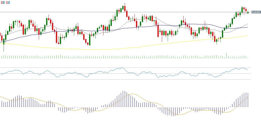 From a technical perspective, the Relative Strength Index (RSI) is currently at 65, indicating positive momentum. The MACD also shows a bullish crossover between the MACD line (blue) and the signal line (orange), reinforcing the positive outlook for the pair.