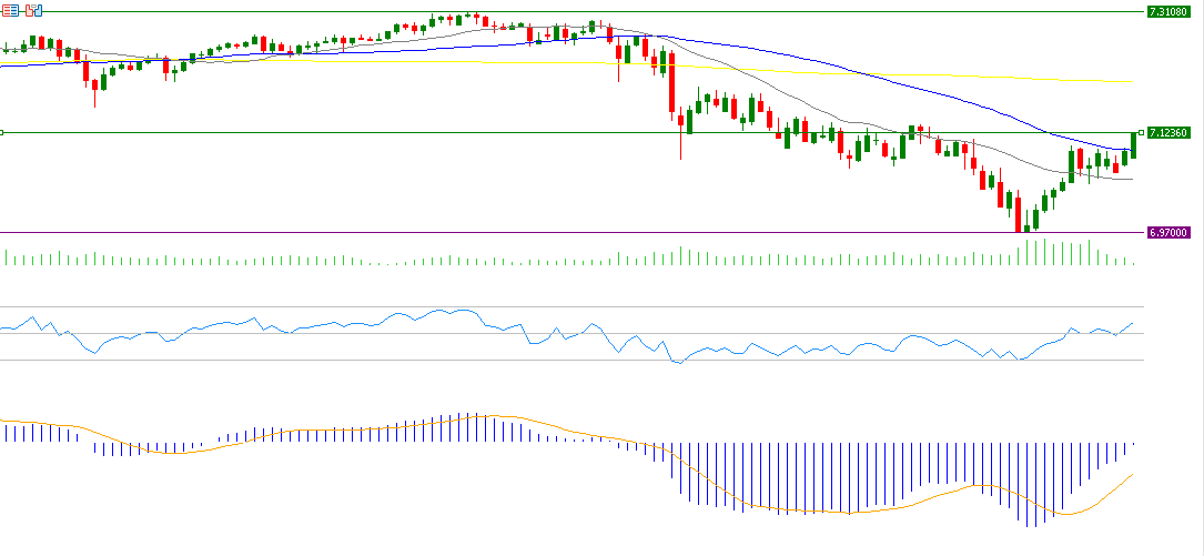 The Relative Strength Index (RSI) currently registers around 58 points, indicating bullish momentum for the USD/CNH pair. The MACD indicator in blue is above the orange signal line, indicating positive momentum for the USD/CNH pair.