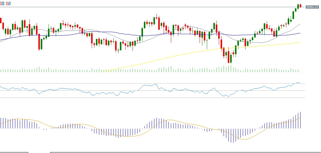 From a technical perspective, indicators continue to support the upward trend in the DAX. The index has recently seen a bullish “golden cross” between the 20-day and 50-day moving averages, a technical signal that suggests further upside potential. The Relative Strength Index is currently near 75, indicating strong positive momentum, albeit within overbought territory, which calls for caution regarding the risk of short-term corrections.