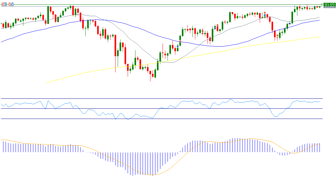 From a technical perspective, there’s a consistent pattern in the moving averages over 20, 50, and 200 days, indicating an upward trend for the dollar against the yen. Specifically, the 20-day average surpasses the 50-day average, and the 50-day average surpasses the 200-day average. However, the primary challenge remains breaking through and surpassing the persistent resistance level of 152 yen per dollar. The Relative Strength Index (RSI) currently stands at 65 points, which indicates upward momentum in the price of the dollar against the yen.