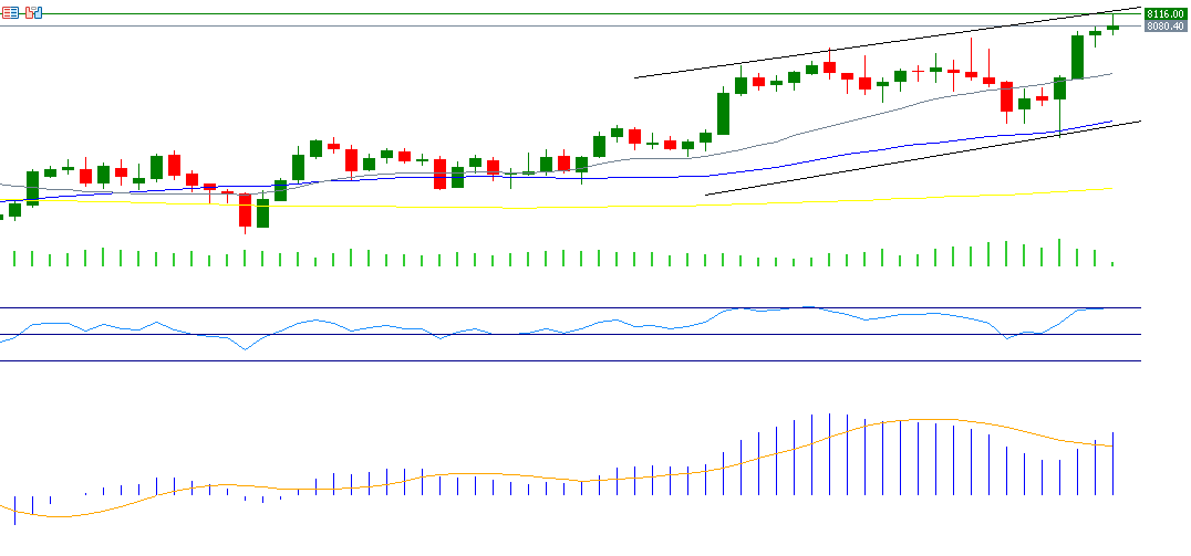 The British FTSE 100 index continues its upward trend for the fourth day in a row, recording 8,116 points today, a new record high. It is currently trading near the 8,100-point level, and it appears that the positive momentum will continue in the next stage, as this index has risen by about 5% since the beginning of the year until today.