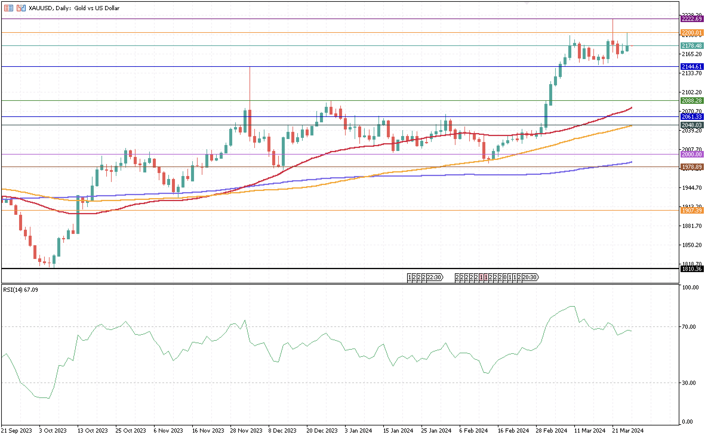 Gold is trading below $2,200 and has maintained a sideways movement during most of March after exiting an overbought market earlier in the month. It reached an all-time high last week on March 21, which is its second closest resistance at $2,222.69. As support, the most significant level for Gold is around $2,144.61, and below that is a second floor at $2,088.28, which is a significant weekly level to monitor.
