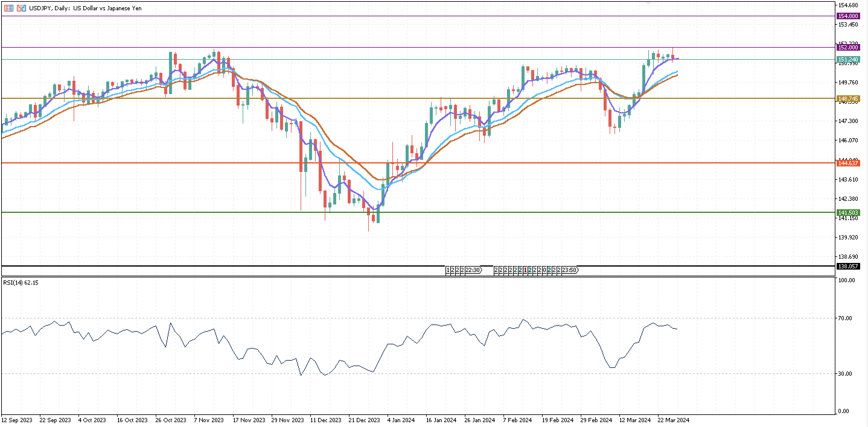 So far, the price of the Yen has yet to reach $152, which is its closest and most significant resistance. The USDJPY traded at $151.96 on Wednesday and is up 7% during the first quarter of 2024. There are three exponential moving averages that are currently supporting the price, 5, 15, and 20-day, and there was a golden cross on March 19 that signalled a bullish trend on the USDJPY that helped the price reach higher highs around $152. At the top, the $154 level is the upper boundary of the range the BoJ is considering to intervene in the market and bring the pair down. Beyond the three exponential moving averages is a monthly support at $148.74.