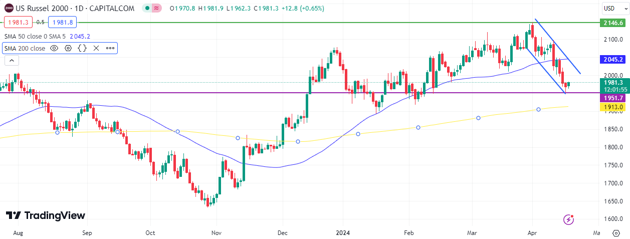 The Russell 2000 index, which is an index of small and medium-sized stocks in the United States of America, continues to decline for the fourth day in a row, recording 1,951.7 points yesterday, which is its lowest level since February 8, 2024. It has declined by about 3% since the beginning of this year until today. The picture appears to be discouraging, and the downward channel is prevailing at this stage, especially since these stocks are negatively affected by interest rates, which appear to remain high for a long period of time, and this is what Federal Reserve Chairman Jerome Powell alluded to yesterday, adding that inflation is still far from the 2% target.
