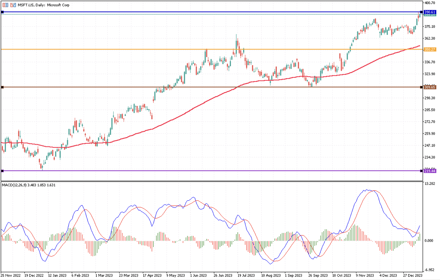 The stock has maintained a bullish trend since January 2023, benefiting primarily from Microsoft’s acquisition of OpenAI and the boom of AI last year. It has moved from $219.44 a year ago to $390.61 on Thursday last week. Additionally, the price has been trading above the 100-day moving average for the last 3 months at $354.59, which is its nearest support. Moreover, there is a second floor at $350.27, which is an important monthly support for Microsoft’s stock. The MACD indicator shows there is an ongoing bullish trend that could push the price higher, making it test the resistance of $390.61 before reaching $400.