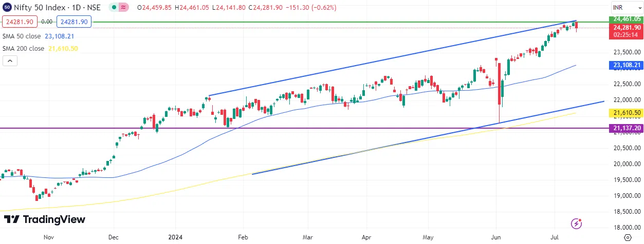 The Indian Nifty 50 index continues its upward trajectory, recording 24,461 points yesterday, its highest level ever. It has also risen by approximately 16% since its low on 24 January 2024, when it recorded 21,137 points. As of now, it is trading near 24,300 points.