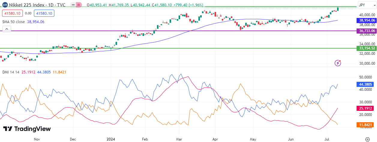 Despite the weakness of the Japanese economy, the Nikkei 225 Index continues its upward trend, reaching a record high of 41,769 points. This index outperforms most global stock indices, having risen by about 26% since the beginning of the year until yesterday’s session.