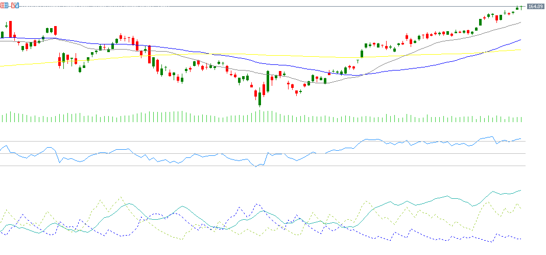 - Moving Averages: The 20-, 50-, and 200-day moving averages are all trending upward. The 20-day MA is above the 50-day, which is in turn above the 200-day — a very positive alignment. Additionally, the 20-day MA at $152 acts as a key support level, currently well below the market price, reinforcing the bullish setup.
