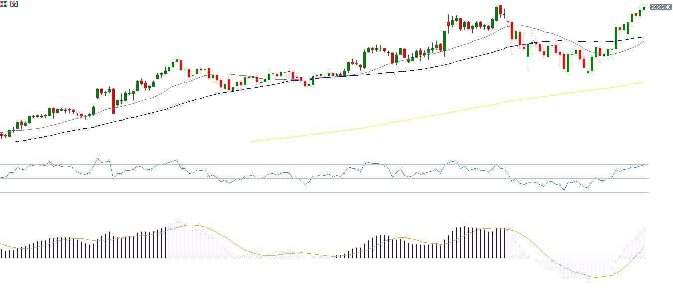 This strong rally in Japanese equities is driven by several factors. One of the most important is the easing of geopolitical tensions in the Middle East. Japan is one of the largest importers of crude oil, and therefore any optimism regarding a truce or resolution related to the Strait of Hormuz tends to support the Japanese economy, especially when oil prices decline. The rally is also supported by Japanese Prime Minister Sanae Takaichi, whose expansionary fiscal policies encourage higher government spending, easier borrowing conditions, and tax reductions, particularly on food products, in an effort to stimulate the stagnant economy. Japanese markets have also seen strong foreign investment inflows into equities this week. In addition, the weakness of the Japanese yen has supported the market, as it recently exceeded 160 yen per US dollar, the highest level since July 2024, encouraging foreign investors to allocate more capital to Japanese equities. The Relative Strength Index (RSI) currently stands at 62, indicating bullish momentum for the index. A bullish crossover between the MACD line and the signal line further strengthens the likelihood of continued positive momentum.