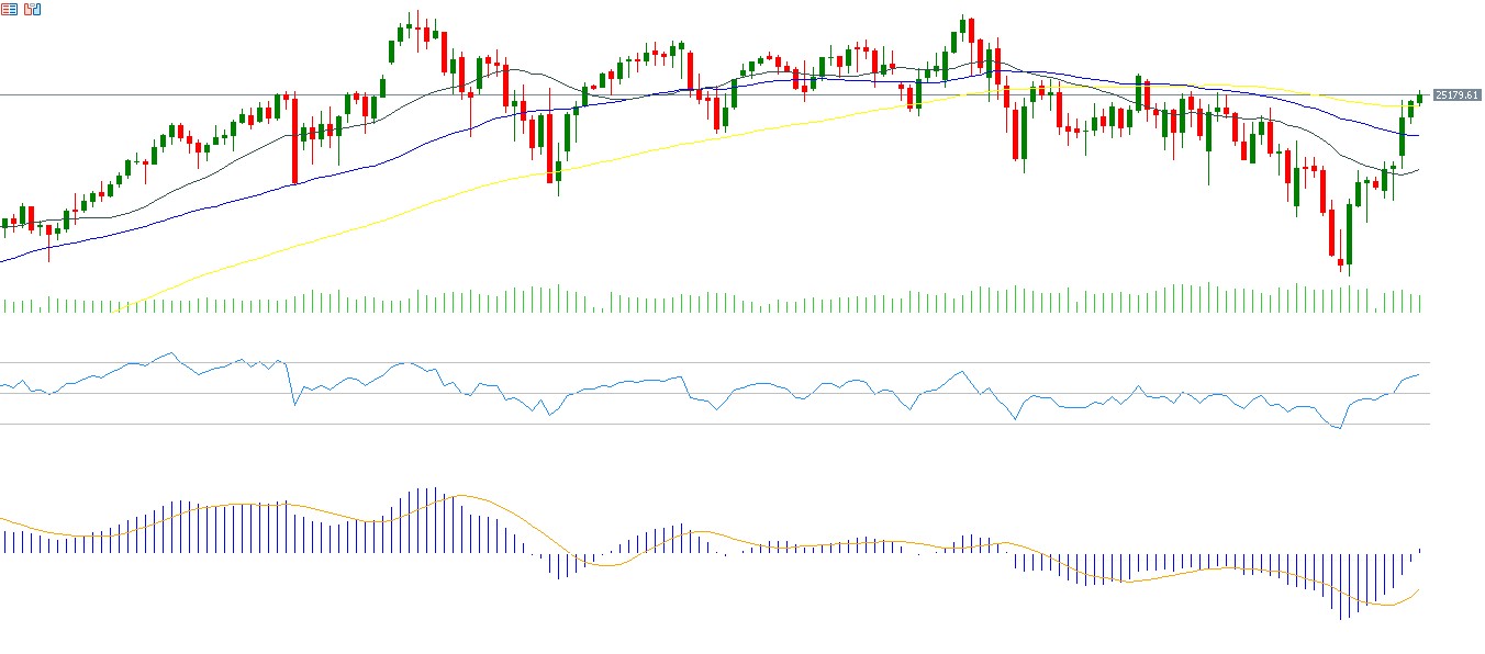 The Nasdaq 100 Index rose by 4.45% last week, closing at 25,116 points, its highest level since February 26, 2026. Despite this rise, the index remains down about 0.50% since the beginning of the year. The VIX volatility index declined to 19 points on Friday, its lowest level since February 27, 2026, reflecting investor optimism and increased demand for U.S. equities. However, despite this strong optimism, U.S. equity markets continue to face several risks during the current period, particularly uncertainty related to geopolitical tensions, inflation concerns, and fiscal risks. Notably, the Philadelphia Semiconductor Index reached a new record high on Friday, rising about 26% since the beginning of the year, reflecting strong optimism surrounding investments in semiconductors and artificial intelligence. The Relative Strength Index (RSI) currently stands at 60 points, indicating bullish momentum for the Nasdaq 100. Meanwhile, the MACD indicator shows a bullish crossover between the MACD line (blue) and the signal line (orange), providing upward momentum for the index.