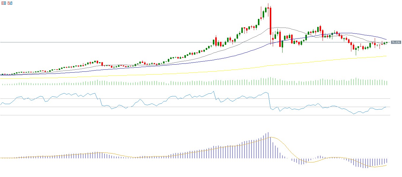 Silver prices have risen for the third consecutive week, closing at $75.93 on Friday and gaining about 6% since the beginning of the year. Over the past week, silver has been trading in a horizontal range between approximately $70 and $77, searching for a clear direction either upward or downward. The Relative Strength Index (RSI) currently stands at 50 points, indicating neutral momentum. Meanwhile, the MACD indicator shows a bullish crossover between the MACD line (blue) and the signal line (orange), suggesting positive momentum for silver.