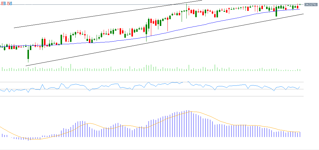 Additionally, there is a regularity in the 20-day, 50-day, and 200-day moving averages, all trending upwards, as the 20-day average surpasses the 50-day average, and the 50-day average exceeds the 200-day average. A bullish crossover also occurred yesterday between the MACD indicator (in blue) and the Signal Line (in orange), indicating the upward momentum for the dollar against the Turkish lira.