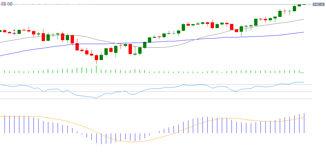 Currently recording 77 points, the RSI is in the overbought zone, indicating bullish momentum for the S&P 500.