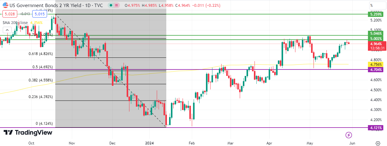 Technically, the momentum appears positive for the two-year bond yield, according to the Relative Strength Index, currently at approximately 59 points. According to Fibonacci analysis, the two-year bond yield is likely to rise to levels of 5.016% (78.60%) and 5.259% (100.00%).