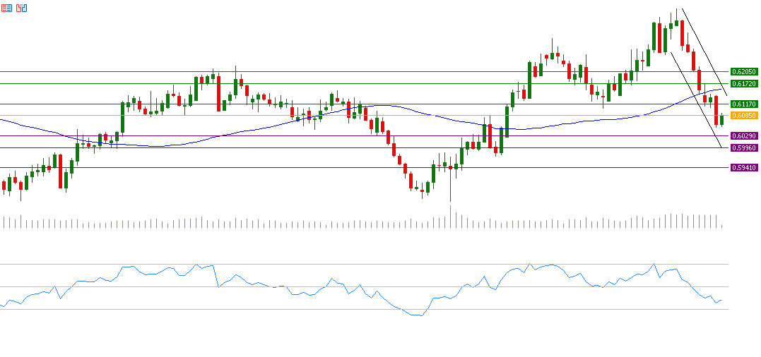 From a technical perspective, if the pivot point at 0.6085 for the New Zealand dollar against the US dollar is breached, it is likely to target support levels at 0.6029, 0.5996, and 0.5941. Conversely, if the pivot point is surpassed, it may aim for resistance levels at 0.6117, 0.6172, and 0.6205. The Relative Strength Index (RSI), currently around 39 points, indicates negative momentum for the New Zealand dollar against the US dollar.