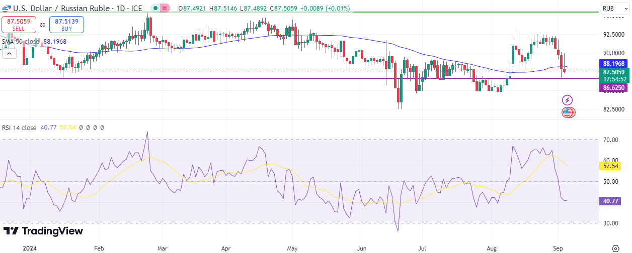 From a technical perspective, if the pivot point at 88.39 for the USD/RUB pair is broken, it could target support levels at 86.49, 85.19, and 83.29. Conversely, if the pivot point is surpassed, it may target resistance levels at 89.69, 91.59, and 92.89. The Relative Strength Index (RSI), currently at 40 points, indicates negative momentum for the USD/RUB pair.