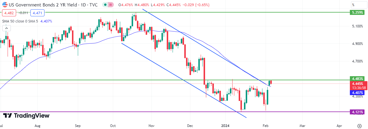 From a technical perspective, a significant resistance level is observed at 4.49% for the two-year Treasury bond yield. Despite attempting to breach this level in two sessions, it failed to do so, indicating the possibility of a rebound in this yield in the near future, especially in the absence of supportive economic indicators favoring higher yields over bond prices.