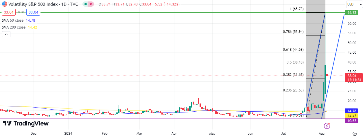 From a technical perspective, according to Fibonacci analysis, the VIX is likely to rise to levels of 44.68 (61.80%) and 53.94 (78.60%).