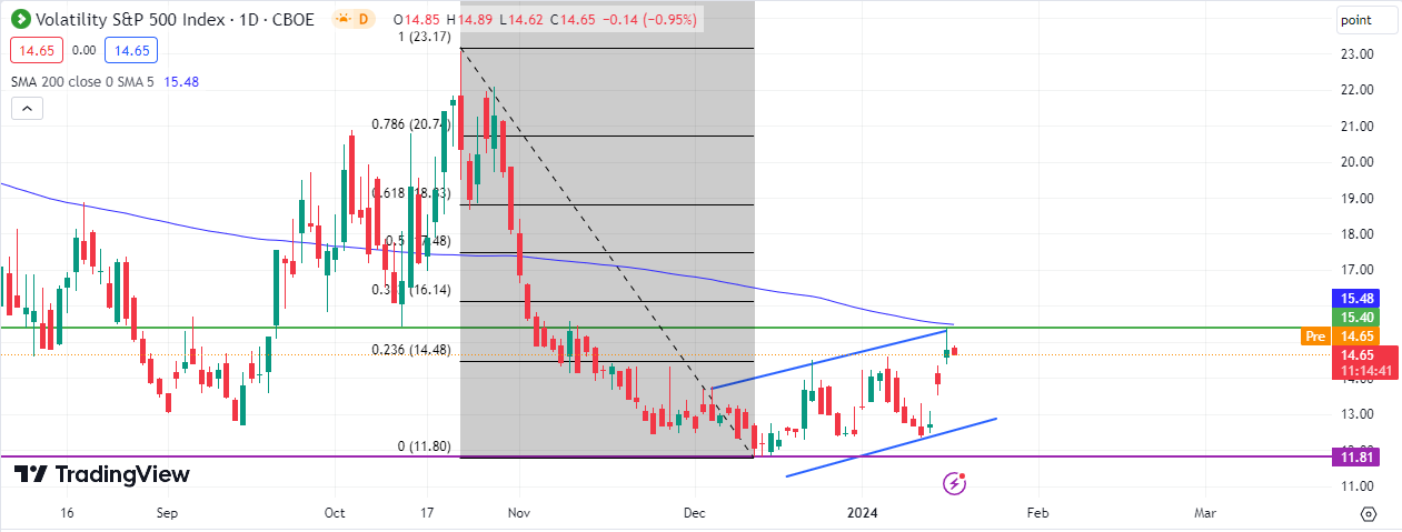 The VIX Fear and Volatility Index, reflecting investors’ anticipated stock market price movements, increased from 11.81 points to around 15.40 points yesterday. This marks its highest level since November 10, 2023, suggesting heightened turmoil and investor unease in the US stock markets.