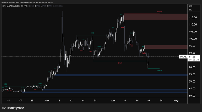 Oil has been the most volatile market for weeks and that is not changing. WTI sits at $89.40 after an extraordinary Friday that saw prices crash over 11% when Iran announced Hormuz was open, followed by a reversal when Iran shut it again on Saturday.