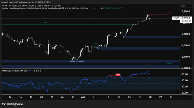 The S&P 500 closed at 7,126 on Friday, marking a fresh all time high. The index has now rallied 3.5% over the past week alone, driven almost entirely by the strength of bank earnings and the brief reopening of the Strait of Hormuz. On the H4 chart, the structure is a clean uptrend with higher highs and higher lows. Support sits at 6,736 on the most recent swing low, with 6,539 below that. The only resistance on the chart is the 7,158 swing high, which is now the level to watch for continuation. The RSI at 68 is approaching overbought territory, which suggests the rally could slow down or pull back before the next leg higher.