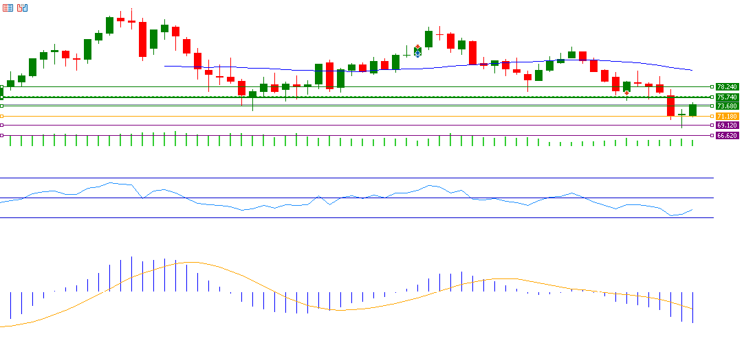 If the pivot point of 71.18 for crude oil is broken, there is a possibility of targeting support levels at 69.12, 66.62, and 64.56. If it exceeds the pivot point, it may target resistance levels at 73.68, 75.74, and 78.24.