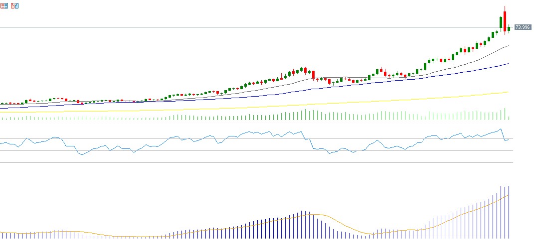 - The RSI currently stands at 68 points, indicating strong upward momentum.